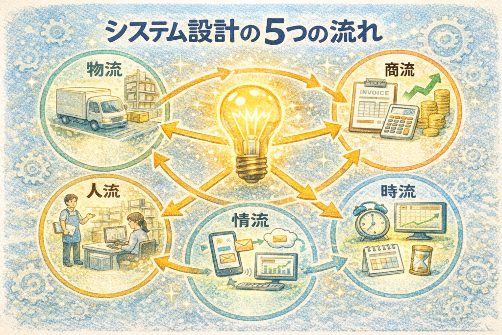 システム設計における最後の流れが「時流」です。これまで見てきた物流・商流・人流・情流は、すべて時間の中で動いています。この時間軸を正しく捉えることで、初めてシステムは現実の業務と一致します。